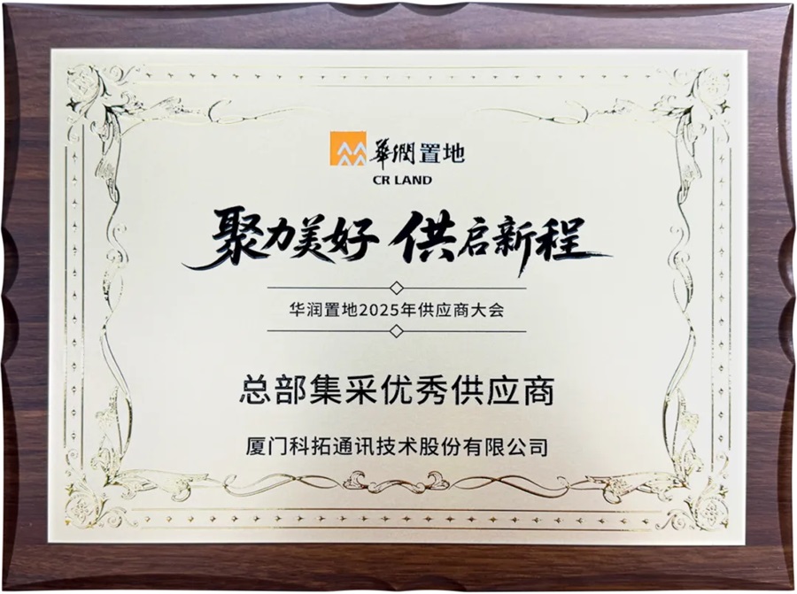 - 2025年,科拓股份凭借扎实的技术实力、可靠的服务体系与良好的市场口碑,成功获评华润置地“总部集采优秀供应商”。这一荣誉不仅是华润置地对科拓综合能力的高度认可,也充分体现了头部客户对科拓长期合作潜力的深度信任。